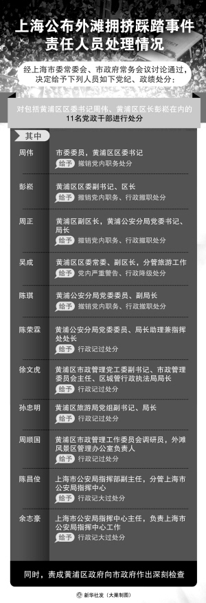 黄浦区区委常委、分管旅游工作的副区长吴成,黄浦公安分局党委委员、局长助理兼指挥处处长陈荣霖等人,对事件发生负有重要领导责任,分别被建议给予党内严重警告、行政降级处分或行政记过处分等处理。