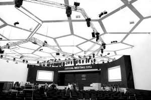 1月20日,工作人员在瑞士达沃斯经济论坛会议中心布置主会场。