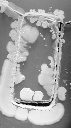 帕克说:“手机好像并不只是储存电话号码,还隐藏着我们身体和其他人、土壤以及其他物质有过接触的历史。作为实用与生物医学细菌学课程的一部分,我要求学生把他们的手机放进细菌生长培养皿中,然后将它们的痕迹留下来。这样做的目标是确定手机携带哪些细菌。这是一个让学生研究经常被忽略的日常生活微生物学的好方法。该方法虽然不寻常,却非常有效。金黄色酿脓葡萄球菌在人体上的生态环境是鼻孔,它们很可能以多种方式感染到手机上。”