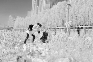 1月22日,游人在吉林市松花江畔的雾凇美景前拍照留念。当日,吉林省吉林市出现雾凇美景,松花江畔满眼的玉树琼花吸引了众多游人。