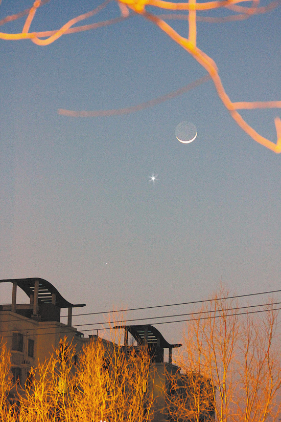 1月22日晚,“金星合月”在周口市区上演。弯月如同一艘银色小船,明亮的金星在月亮左下方的天区跟随着它。晚报记者 金月全 摄