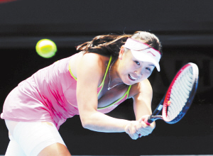 1月25日,中国选手彭帅在比赛中。当日,在墨尔本举行的2015年澳大利亚网球公开赛女单第四轮的比赛中,中国选手彭帅以0∶2不敌俄罗斯选手莎拉波娃,无缘八强。