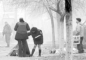 1月24日,在马里乌波尔街头,乌内政部门工作人员察看遇难者遗体。