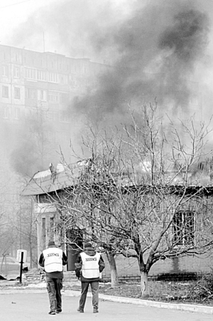 1月24日,在马里乌波尔,欧安组织成员察看遭火箭弹袭击的现场。