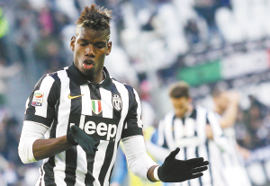当地时间1月25日,尤文图斯队球员博格巴庆祝进球。当日,在2014-2015赛季意大利足球甲级联赛第20轮比赛中,尤文图斯队主场以2∶0战胜切沃队。新华社发