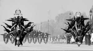 每年,印度“共和国日”阅兵仪式都会融入传统音乐、部落舞蹈、摩托车特技表演等内容,今年则增加了一些新特色。印度边防部队士兵骑着盛装打扮的骆驼,出现在今年阅兵仪式上。