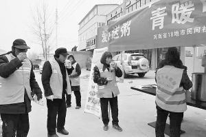 1月27日,为让环卫工人、五保老人等弱势群体感受到节日的温暖,商水县委宣传部、商水团县委联合该县阳城志愿者协会走街串巷,为他们送去带着浓浓温情的腊八粥。