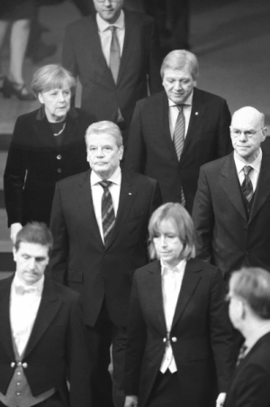 1月27日,在德国柏林国会大厦,德国总理默克尔(三排左)和德国总统高克(二排左)出席联邦议会特别议程。