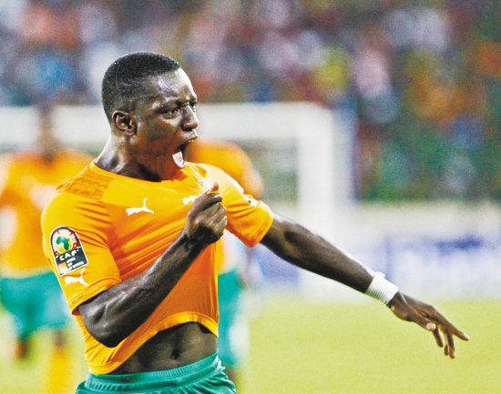 非洲杯:科特迪瓦晋级八强 当地时间1月28日,科特迪瓦队球员格拉德尔在比赛中庆祝进球。当日,在赤道几内亚马拉博体育场进行的非洲杯D组小组赛最后一轮比赛中,科特迪瓦队以1∶0战胜喀麦隆队,排名小组第一,晋级八强。新华社记者 李京 摄