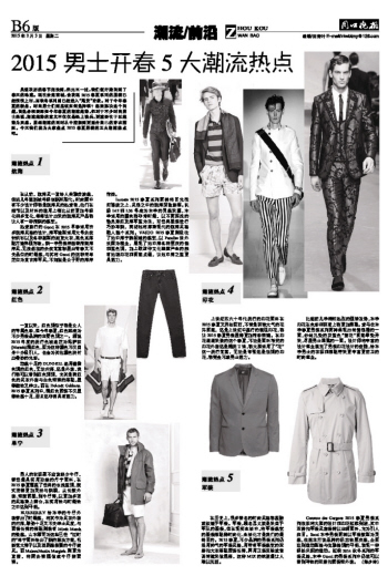虽说农历的春节还没到,但元旦一过,我们便开始闻到了春天的味道。现在去逛商城,会发现2015春夏系列的服装已经悄悄上市,而秋冬系列则已经进入“尾货”阶段。对于今年春夏的新品,时尚男士们到底该如何选择呢?想要解决这个问题,首选必须要深知今年春夏的潮流趋势,但对于不少时尚男士来说,潮流趋势的意义不仅仅是纸上谈兵,更重要在于以趋势为灵感,紧跟潮流的同时从中挖掘到更适合自己的穿衣搭配,今天我们就为大家盘点2015春夏男装的五大潮流热点吧。