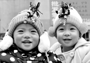 2月3日,在江苏省徐州市睢宁县一小区内,两名小朋友在帽子上佩戴“春鸡”。