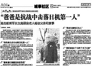 得知读者建议为高志航将军建纪念馆一事,高志航的长女85岁的高丽良老人在电话中哽咽着对记者说:“谢谢你们没有忘记历史,我给你们鞠躬了。”她表示非常支持儒静的想法。当年2月25日,本报A04版刊发了这位老人对周口人没有忘记历史、没有忘记英雄的感激之情。之后,高丽良与记者畅谈了父亲和一些家事,让市民更近距离地接触英雄,本报于当年2月27日A04版以《爸爸是抗战中击落日机第一人》为题进行了报道。