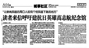 2014年2月20日,本报A04版刊发了读者儒静(笔名)致信本报呼吁在周建高志航纪念馆一事,“让崇尚英雄的周口人民有个给英雄下跪的地方”,并以高志航事迹为感召,在周口人心目中“重塑民族精神”。除了晚报读者的身份,儒静还是市政协委员。