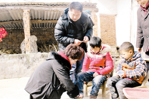 李雪霞帮孩子穿鞋。晚报记者 王凯 摄