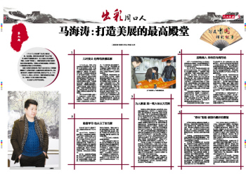 1月16日上午,记者一行坐地铁前往丹凤朝阳美术馆。因之前没人介绍马海涛其人其事,在路上,记者猜测马海涛可能是个鹤发童颜的老人,抑或是一身大褂的中华艺术家,在这样想当然的猜测中,我们见到了马海涛。不仅是出乎意料,更是惊奇,眼前的马海涛和记者的想像几乎是天壤之别。30多岁,利落的短发,白皙的肌肤,上身着西式深褐色毛呢褂,下身着黑色毛料裤子,格纹围巾搭在胸前,很是潇洒,一双憨厚的眼睛掩盖不了他的少年老成。的确,他就是马海涛,一得阁丹凤朝阳美术馆的馆长。笑谈他的年轻,他只说自己经历颇丰,最喜欢在安静的环境下独自思索。