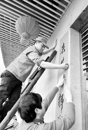 2月15日,湖北宣恩义工协会的义工们为邹春花的新家贴春联。当日,湖北省恩施土家族苗族自治州宣恩县义工协会的20多名义工代表,带着家具、电器、衣服等生活用品前往该县万寨乡长沙河村,为6岁女孩邹春花布置新家。