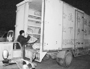 早上7时30分以后,店内整理货物的工作几乎进行完毕,郑定方和外甥女婿便开始了下了步工作——送货。外来顾客的货车在停车场,他们要把打包好的水产品送到停车场,按订单装车、收钱;中心城区大酒店、饭店订购的水产品,要送货上门。