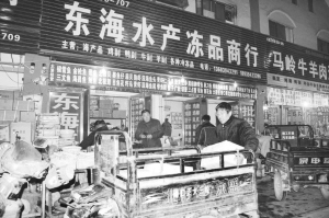 记者随着熙熙攘攘的人群,进入一家名为东海水产冻品商行的店内。