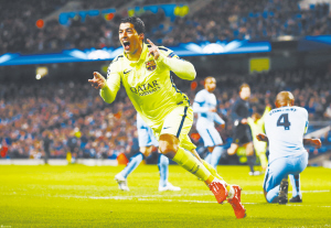 本报综合消息 在巴萨MSN(梅西、苏亚雷斯、内马尔)进攻三叉戟中,苏亚雷斯一直扮演“小三”的角色,不过2月25日凌晨他重返英超球场,在巴萨客场与曼城的欧冠大战中梅开二度,再次让英超后卫不寒而栗。