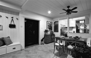 在厨房和餐厅里加一点儿“野味儿”,顿时让烟火空间充满童趣和色彩。乳白色的地砖和淡白吊顶做底,绿色植物和木色家具给餐厅带来清新气息,门口的迎宾小鹿点亮空间,让人仿佛置身童话世界;小鸟造型的衣帽挂钩一字排开,形态各异,打破了静物的单调。墙壁上的壁画、多彩的餐具、长凳上的靠垫,让家常饭菜也充满丛林野餐的乐趣。