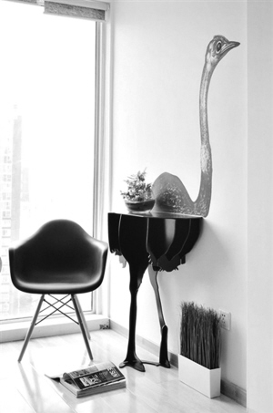 边桌一般作为实用性很强的家具无处不在,由于经常处于不显眼位置,如何装饰得当又不喧宾夺主,这考验着设计师的想象力。这款鸵鸟造型的边桌使桌子本身造型与所靠墙壁融为一体,延伸到墙壁上的鸵鸟图案栩栩如生,让白色呆板墙壁生动起来,仿佛小桌子立马能放开脚步奔跑过来。即使在此角落“独居一隅”,也不缺乏玩味欣赏的乐趣。