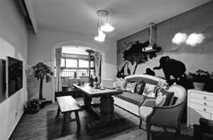 客厅里的背景墙是不容忽略的地方,这里的装饰方法往往很雷同:装饰画、照片墙、马赛克或者布艺软包……在这个本来空间就不大的客厅里,主人选择了一组草原手绘画,大象、长颈鹿的剪影让人仿佛置身非洲大草原之中,使狭隘的空间多了一丝探索的神秘感。墙壁上的云朵壁灯让草原变得遥远,更像远观的一张美丽图片。原木长桌和长凳与自然粗犷的风格相呼应,即使在室内客厅,也心系自然。