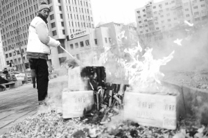 2月25日,环卫工人在沈阳惠工广场清扫“开门炮”纸屑。