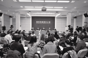 2月27日,国务院新闻办公室在北京举行国务院政策例行吹风会,国家税务总局副局长解学智、国务院行政审批制度改革工作领导小组办公室负责人吴知论、财政部副部长史耀斌、国家工商总局副局长刘玉亭(主席台左二至左五)介绍有关工作情况和措施,并回答记者提问。新华社记者 李鑫 摄