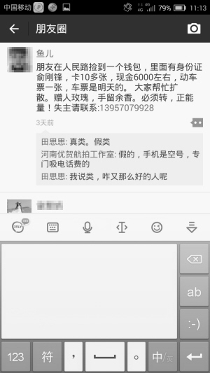 网友转发的微信朋友圈消息称:“朋友在人民路捡到一个钱包,里面有身份证俞刚锋,卡十多张,现金6000元左右,动车票一张,车票是明天的……必须转,正能量!失主请联系:13957079928。”