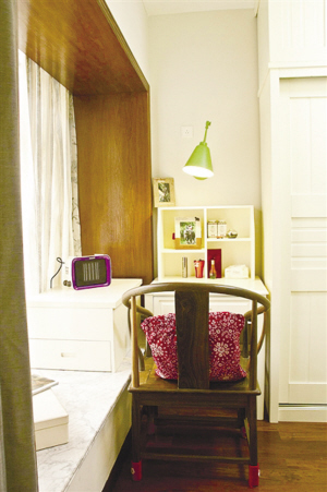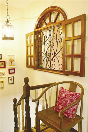 客厅电视背景墙的仿古石墙、实木吊顶,都是美式家居中常见的手法。刷了白漆的沙发背景砖墙、吊顶杉木板,省钱一百分,美观不打折。新居需要搬来原有的中式家具,聪明的女主人就用美式的靠枕将两种不同的风格“衔接”起来。家中挂画、摆件,都值得细细品味,可见女主人对生活的热爱和智慧。(巫碧燕)