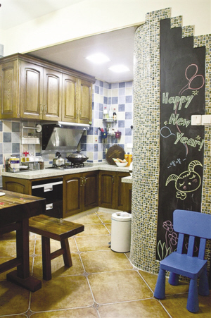 细节上,能看出设计师的用心。客厅与餐厅之间的拐角,原本是一根直径12厘米的大排水管,设计师用一个弧顶的黑板将其掩盖,既是家庭的“公告板”,又可以给孩子画画。