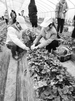 10时30分,“旅程”拉开帷幕,大家首先来到草莓示范园。在这里,孩子们每人提着一个篮子进入大棚摘草莓(如图),分享劳动成果,体会采摘乐趣。“前一天听说要来摘草莓,我非常兴奋。”“哈哈,我第一次摘草莓也和你一样。来,这个草莓个大,快放进你篮里。”商水县的小富云和刚结识的朋友尝着草莓,聊起第一次采摘经历,不禁笑出声来。