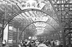 3月4日,游人从太原动物园庙会的灯笼长廊下经过。