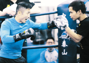 3月5日,邹市明(左)在训练中。当日,中国拳手邹市明在澳门威尼斯人酒店进行公开训练,备战将于3月7日举行的“金光激战”拳击赛。新华社记者 卢炳辉 摄