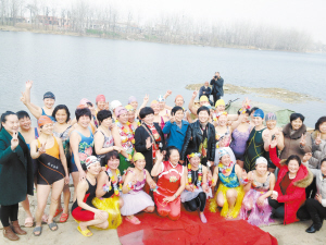 3月7日,春寒料峭,沙颍河周口市区段的南岸热闹非凡,我市百余位女游泳爱好者进行游泳表演,以庆祝妇女节。
