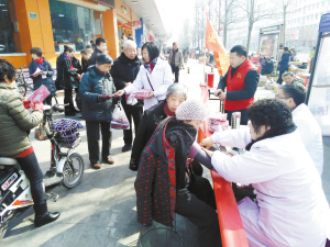 3月7日,周口市区七一路与中州大道交叉口,市机关事务管理局志愿服务队、周口义工协会联合金海社区卫生服务中心举办的“呵护女性·关注健康”志愿活动,在三八妇女节为我市女性送去一份健康大礼。志愿者为200名女性发放免费体检表。晚报记者 张燕 摄