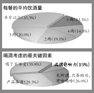调查显示,春节期间每餐喝酒半斤以上的仍然不在少数。新浪河南的问卷调查显示,每餐喝酒半斤以上的高达33.3%,4两的占14.3%,3两的占20.0%,2两和1两的分别占19.1%和13.3%。