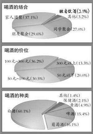 九州糖酒网调查结果显示,春节期间,喝白酒的人数占56.12%;其余,葡萄酒为21.43%,啤酒6.12%,黄酒、保健酒及其他的份额加在一起则为16.33%。新浪河南调查结果显示,春节期间,喝白酒的人数占60.1%;其余,葡萄酒为16.1%,啤酒15.4%,黄酒、保健酒及其他的份额加一起还不足10%。从以上调查结果来看,白酒仍然是重大节日消费的主要选择用酒,从而也彰显了白酒深厚的历史文化积淀和强大的市场消费基础。但整体来看,也基本上呈现了百花齐放,各取所需的消费格局。