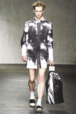 本季的Hyperdrive系列是一次有关青春期与力比多的狂欢。从面料到细节设计都呈现出百无禁忌的自由感,60年代Op Art 印花的针织上衣、不对称无袖Polo衫、开放式裤装与充满想象力的不同风格上装进行搭配。系列中外套胸口处的尼龙材质圆形镂空设计和PVC气阀元素成为又一亮点,海军绳索主题外套,突出的后颈部开口表露了青春期文身的自然留白。外套肘部复杂功能性结构,也体现青少年对时装需求的复杂与多样。