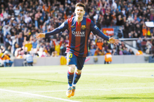 巴塞罗那队头号球星梅西在比赛中庆祝进球
