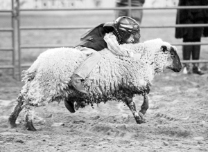 3月8日,在美国休斯敦牛仔节儿童骑绵羊比赛中,一名小牛仔紧紧抱住绵羊。