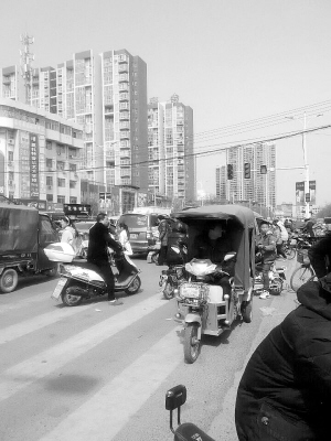3月10日11时40分许,正值学生放学时间,记者在现场看到,该路口东南西北4个方向的交通信号灯全部不亮。没了交通信号灯的“指挥”,公交车、小轿车、出租车、摩托车、电动车、自行车和行人互不相让(如图)。就在采访期间,记者看见,经过此处的三四个小男孩,尽管身边全是车,却毫不害怕,一边过马路,一边互相拍打开玩笑,真让人捏把冷汗。