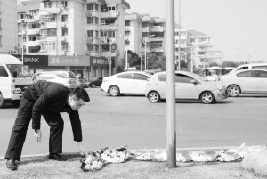 3月12日,一名交警下班后来到茆盛泉执法时不幸殉职的路口献花。