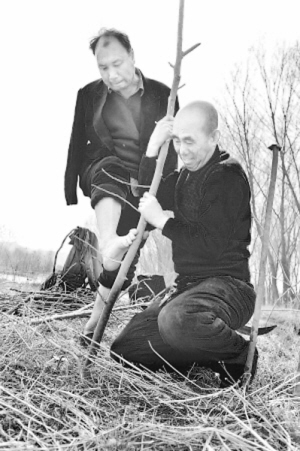 由于河滩上到处都是石块,插枝是件很费劲的事。贾文其用脚支起铁钎,贾海霞用铁锤用力向下砸,在地上打下大约50厘米深的洞,再将砍下的树枝用力插在里面。“别人用镐和铁锹,俺们用钢钎、铁锤。”贾文其告诉记者,他们种的都是本地杨和本地柳,修剪树木时,砍个枝儿插进去浇水踩实就能活,不用花钱买树苗儿。