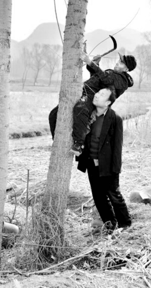贾文其用肩膀将贾海霞顶起来,贾海霞用镰刀将大树多余的枝杈砍下来做树苗。