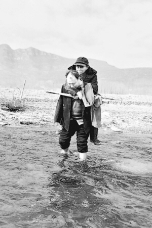 贾文其蹚着冰凉的河水,将贾海霞背到植树地点。