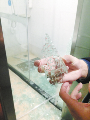 3月14日,记者来到王先生入住的酒店,在王先生当日所住的房间内看到,卫生间内洗澡间的玻璃门已经完全碎裂,地上都是碎玻璃。“当时我在上厕所,并没有碰洗澡间的玻璃门,突然玻璃门全碎了,我当时吓了一跳,所幸没有受伤。我告诉酒店工作人员后,谁知道对方称我们也有一定的责任,并要求赔偿。我觉得洗澡间的玻璃门是因为热胀冷缩出现碎裂,要是人为的话怎么可能会碎成这么小的块状。”王先生的朋友说。