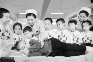 3月19日,河北省邯郸市第二医院的医护人员指导小朋友学习正确的睡眠姿势。