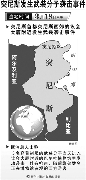 据消息人士说,3月18日上午,3名持有冲锋枪和手雷的武装分子伪装成士兵进入突尼斯议会大厦附近的巴尔杜博物馆,随后挟持了在博物馆参观的大量游客。