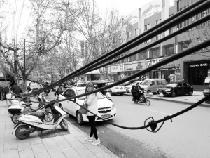 昨日上午,记者来到五一路与育新路交叉口,看到脱落的电缆位于路口南30米路东侧的人行道上。这些电缆共有5根,脱落部分10多米,距地面不到1米,正好挡在人行道上。一些市民从此经过时,要么绕行,要么弯腰低头从电缆下钻过去。